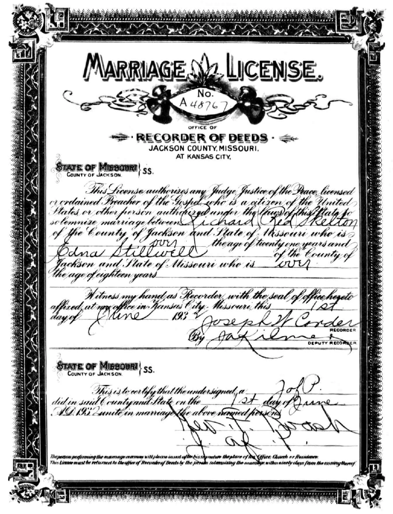 | 1915 | 05/25 | 05/25/1915 - Born: Edna Marie Stillwell, Mt. Washington, Jackson Co., MO. | ||